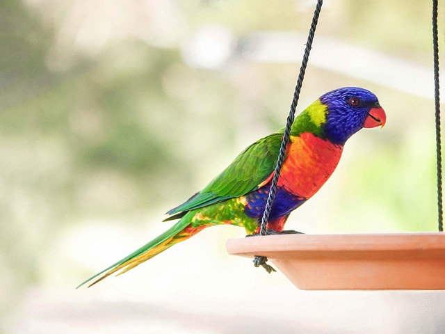 - Higiene: Es necesario limpiar diariamente la jaula y los accesorios de tu Trichoglossus haematodus para prevenir infecciones y enfermedades. También es recomendable bañar a tu loro arcoíris de vez en cuando.